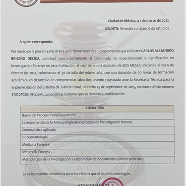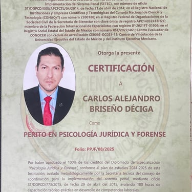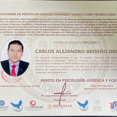 Psicólogo Forense (Academia de Peritos en Ciencias Forenses y Consultoría Técnica Legal A.C.)Desarrollo de funciones periciales especializadas y consultoría técnica en el campo forense.